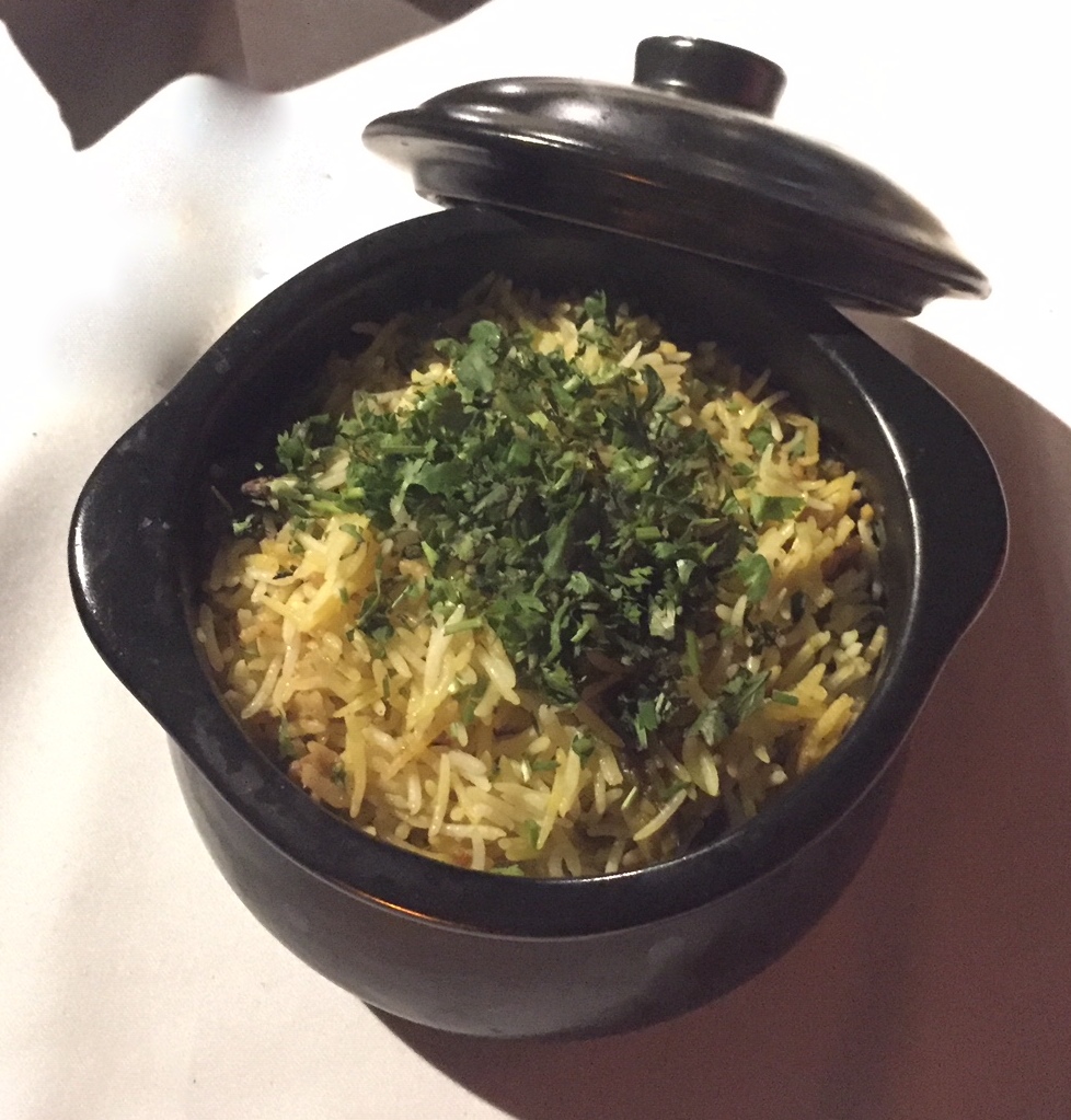- Vegetable Dum Biryani- Aged basmati rice cooked with vegetables, brown onion & saffron, finished with ghee and topped with coriander. The perfect spices and the perfect ambrosial is what all this dish requires.